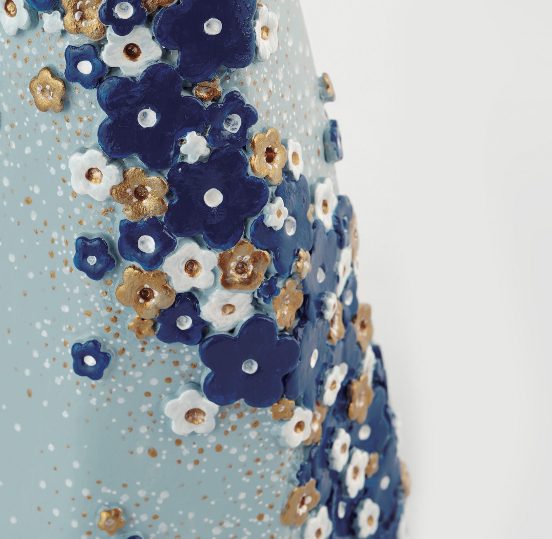 • Superfície decorativa com flores cerâmicas 3D em azul, branco e dourado