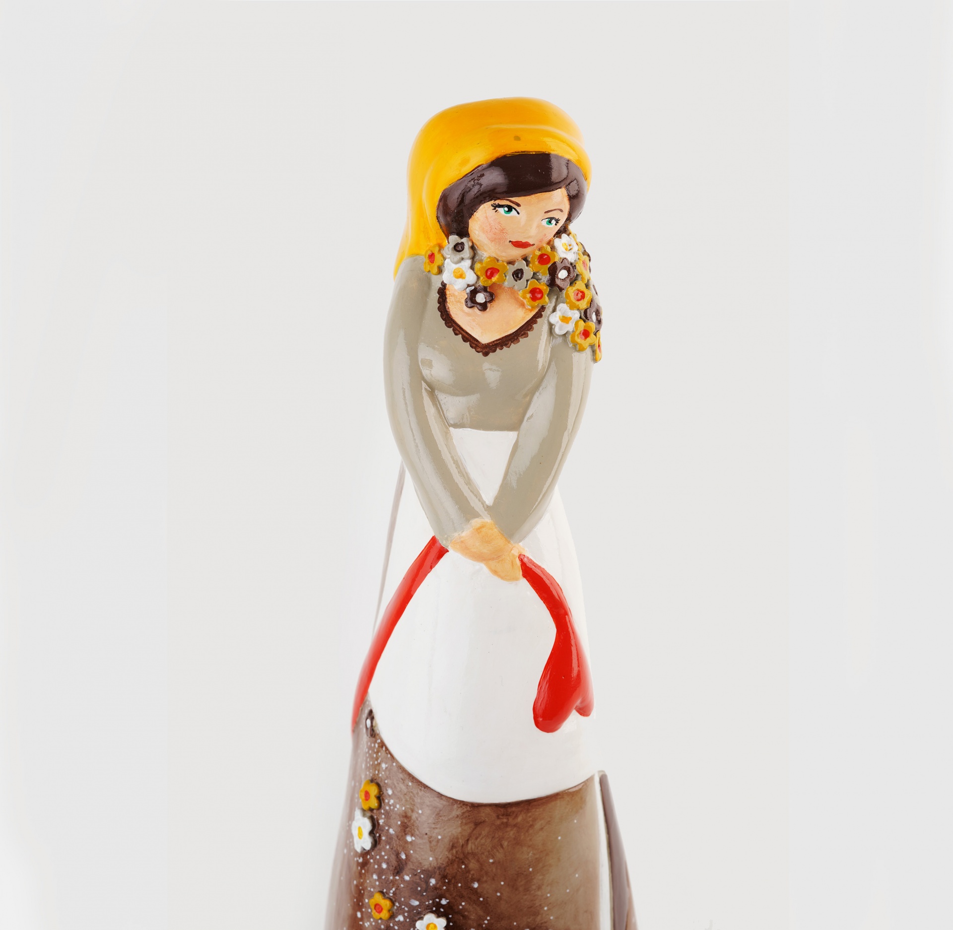 • Figurinha de mulher em cerâmica com vestido e lenço amarelo