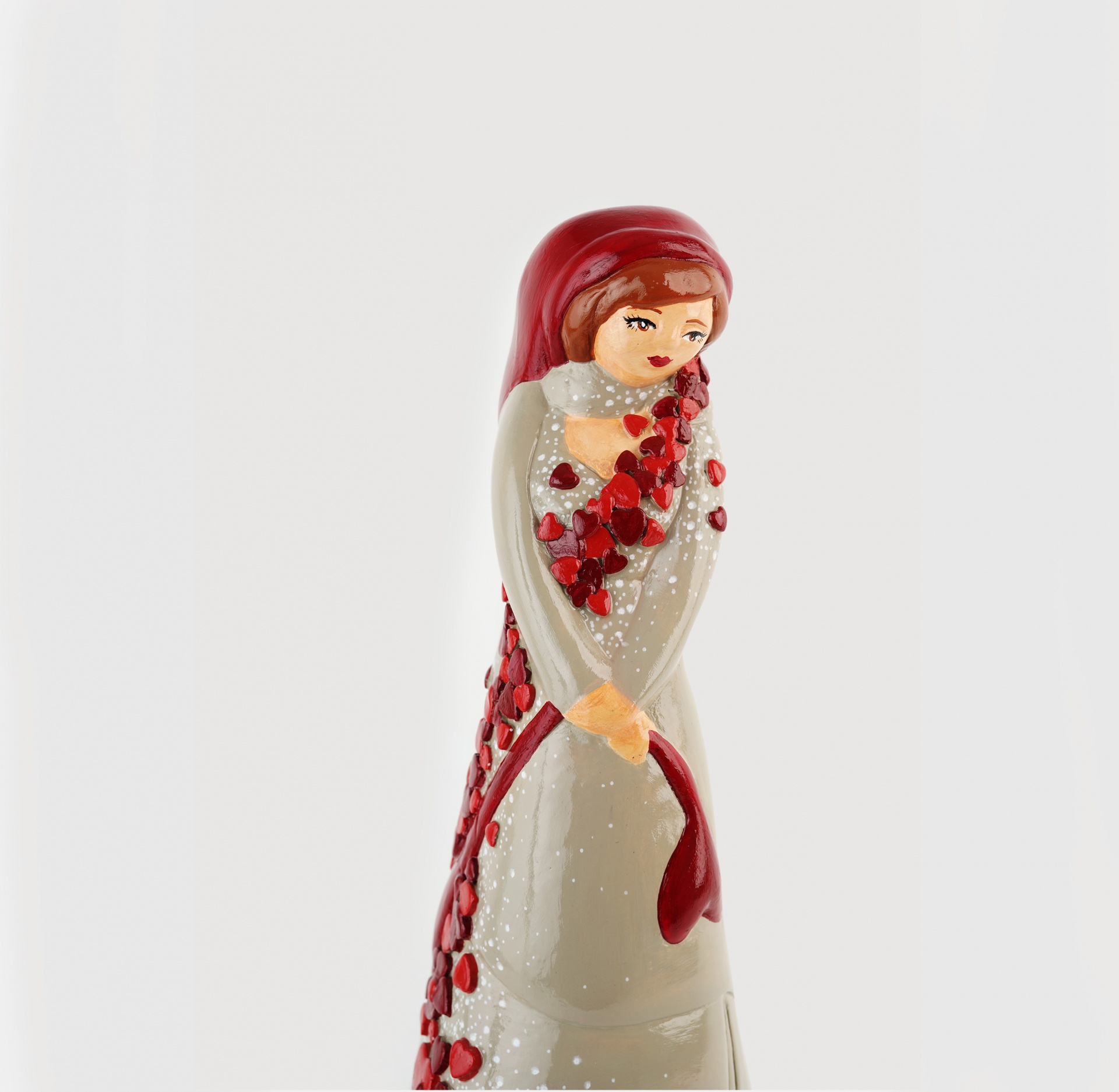 • Figurina de cerâmica mulher vestido branco com corações vermelhos
