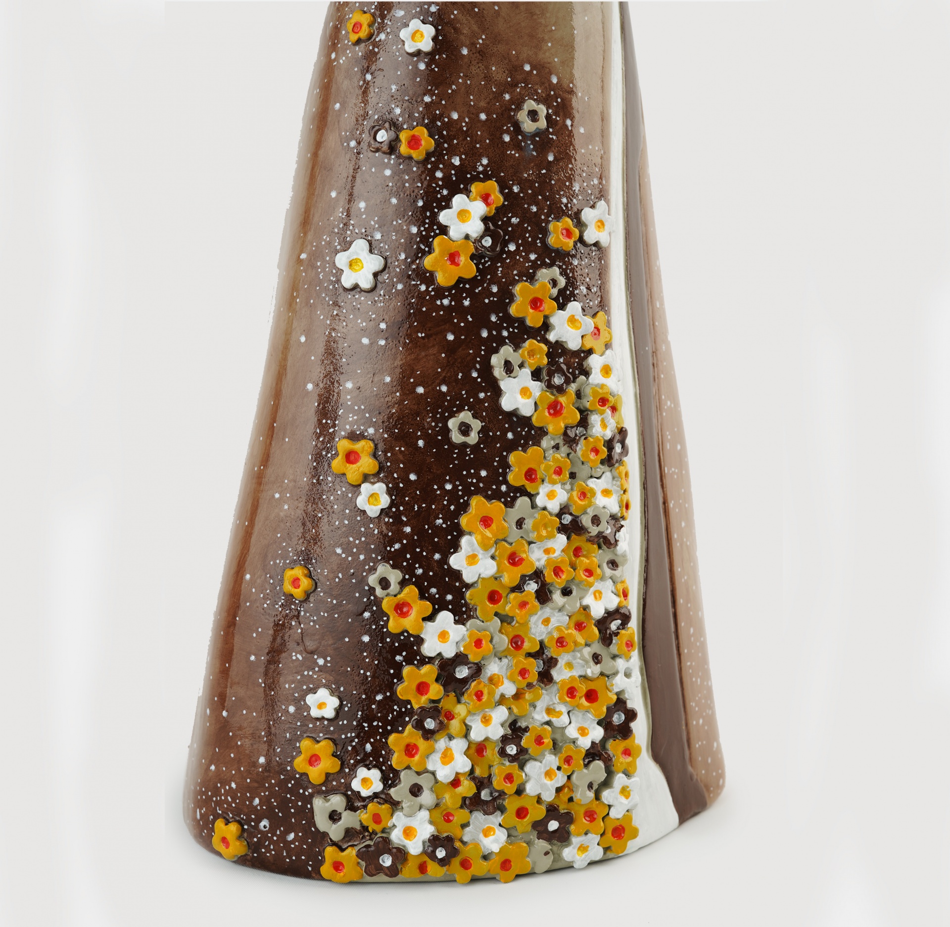 • Vaso decorativo cónico em cerâmica castanha com padrões florais amarelos e brancos