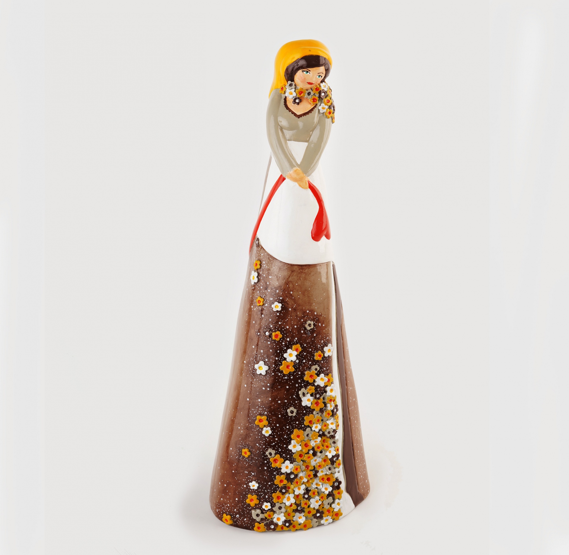 • Estatueta decorativa de mulher com vestido castanho florido e avental branco