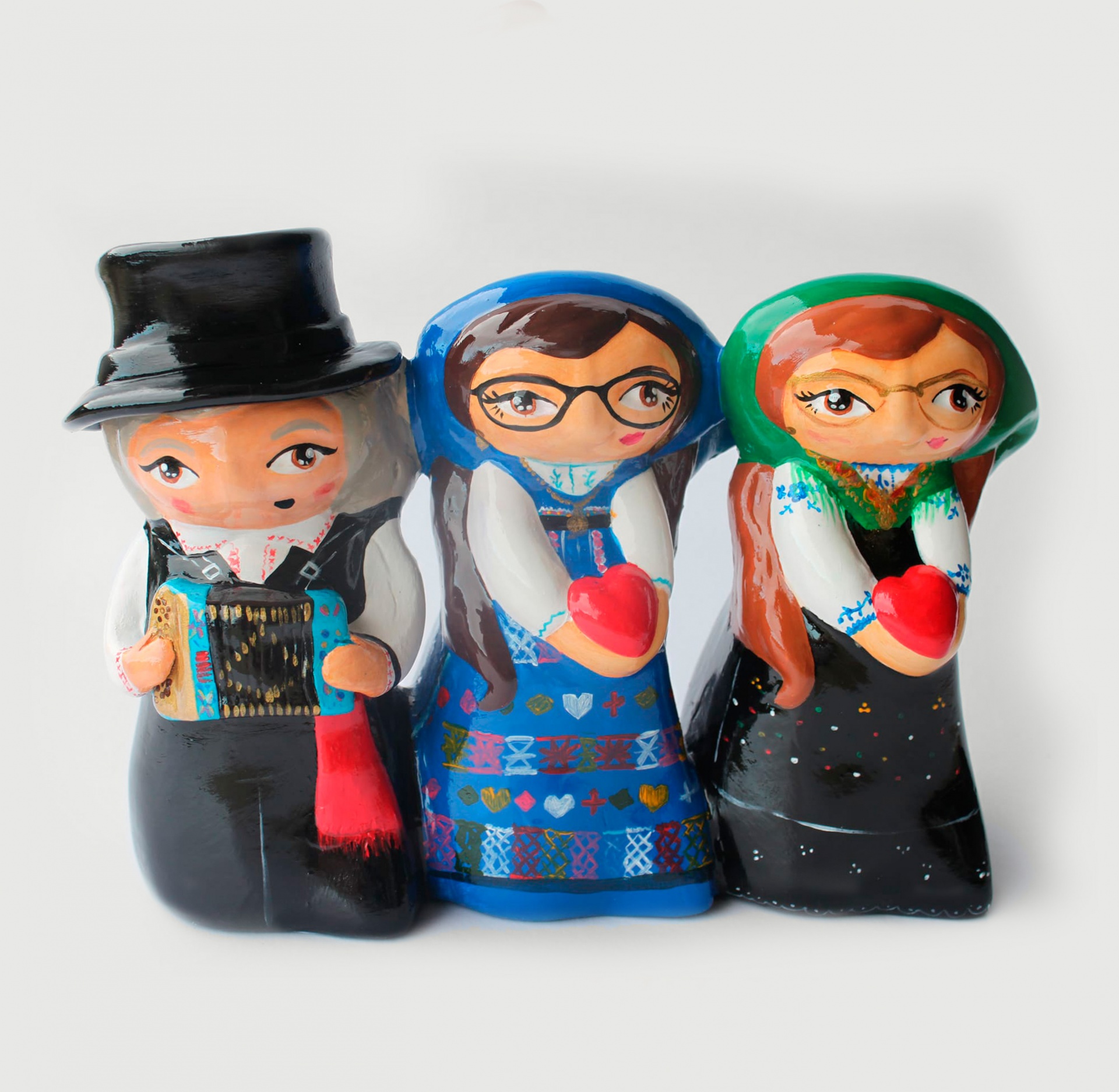 • Três figuras decorativas cerâmicas em trajes tradicionais coloridos