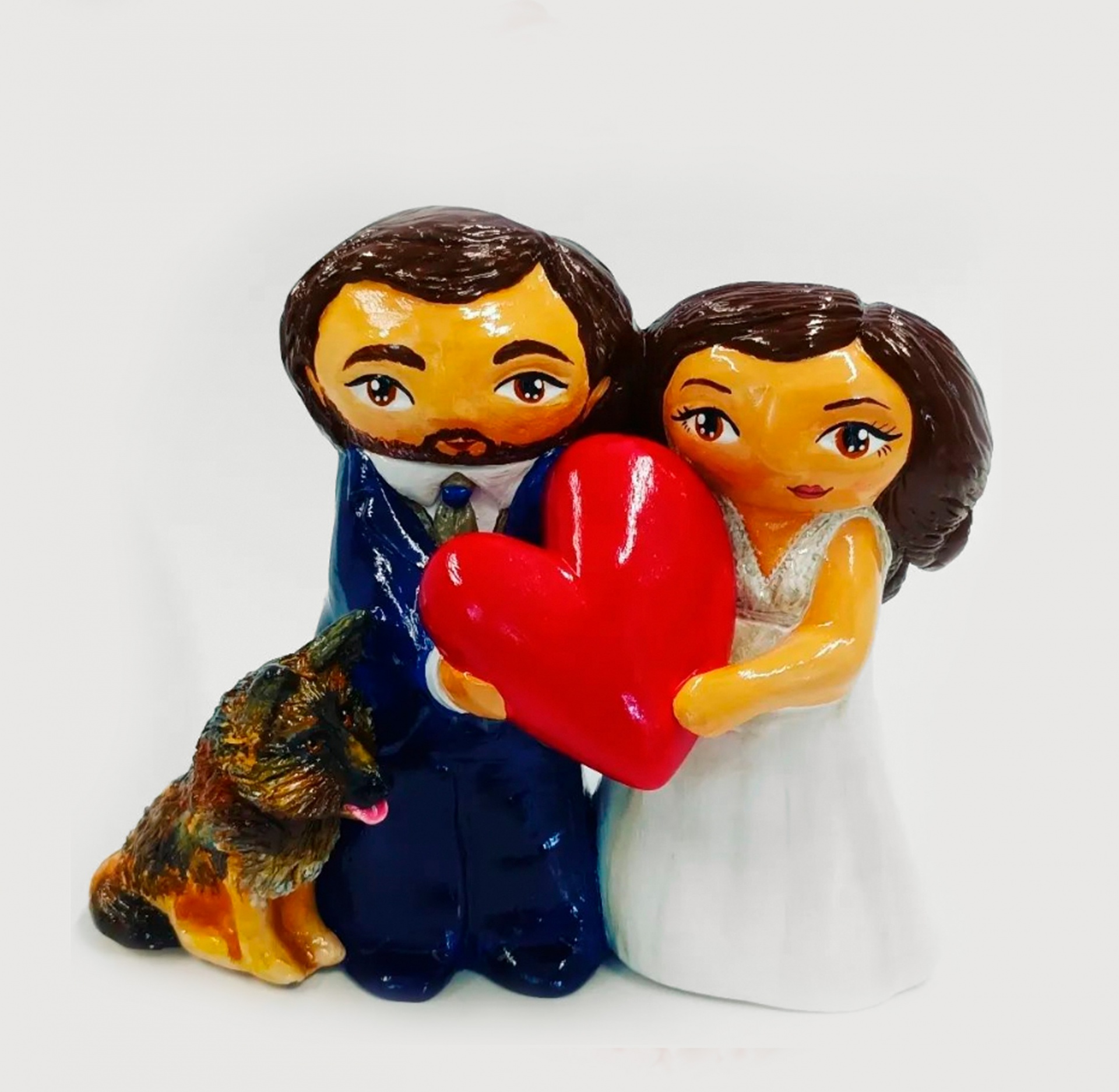 • Figura decorativa de casal de noivos com coração vermelho e cão