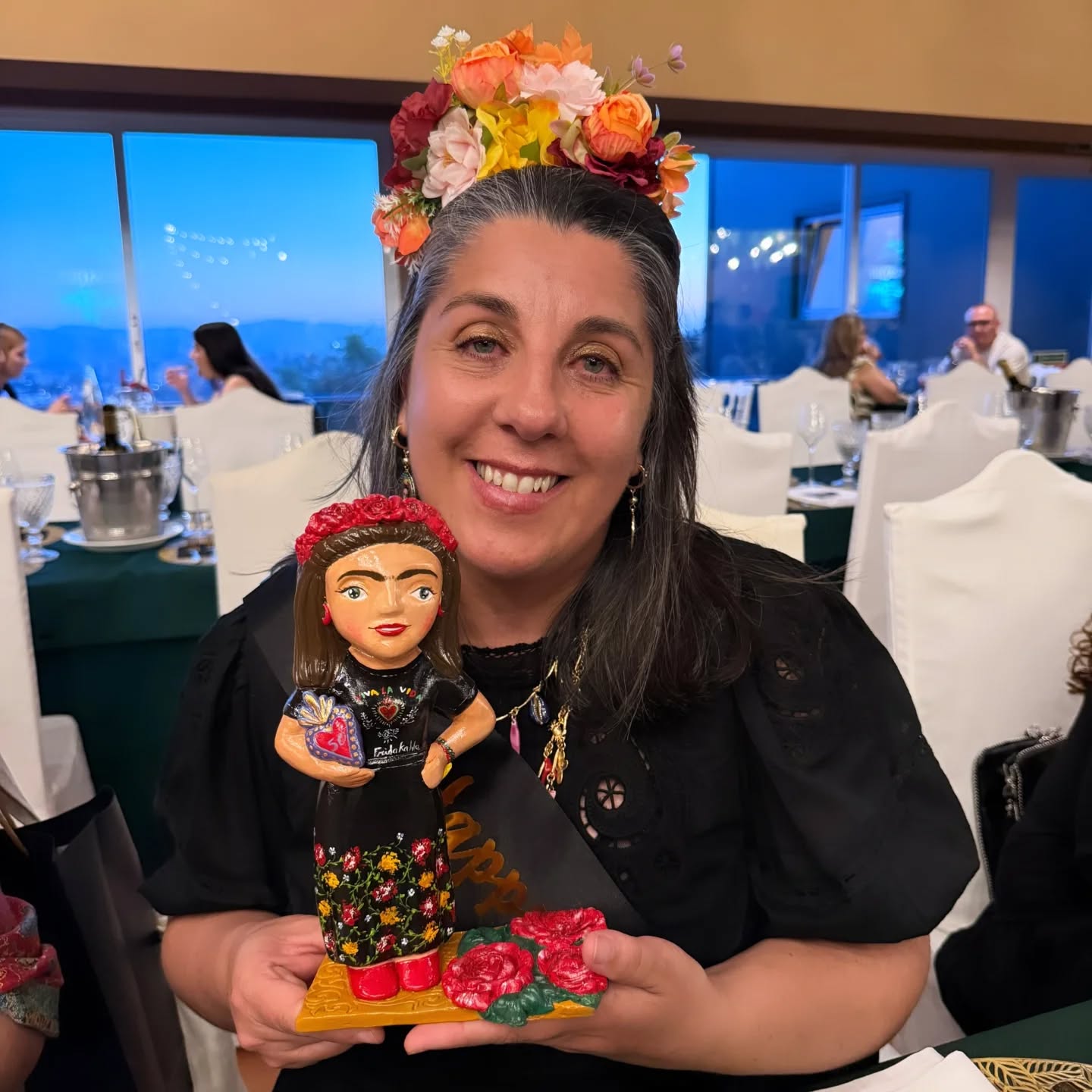 • Mulher com coroa de flores colorida segurando figura artesanal colorida num restaurante