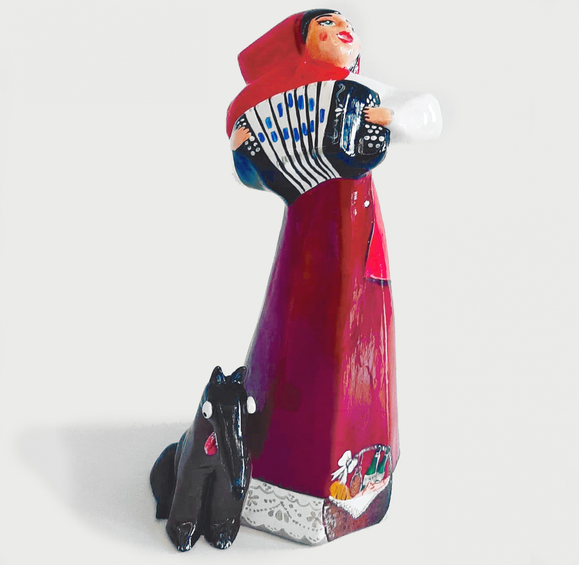 • Figura de cerâmica de mulher com acordeão e cão preto