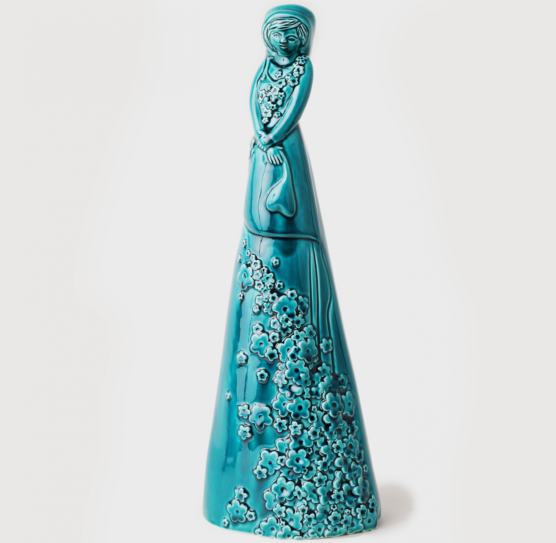• Escultura decorativa de mulher em cerâmica azul claro com flores em relevo